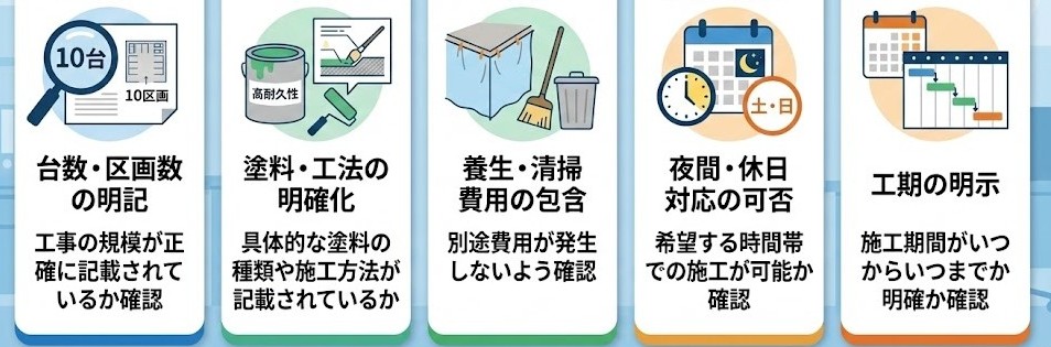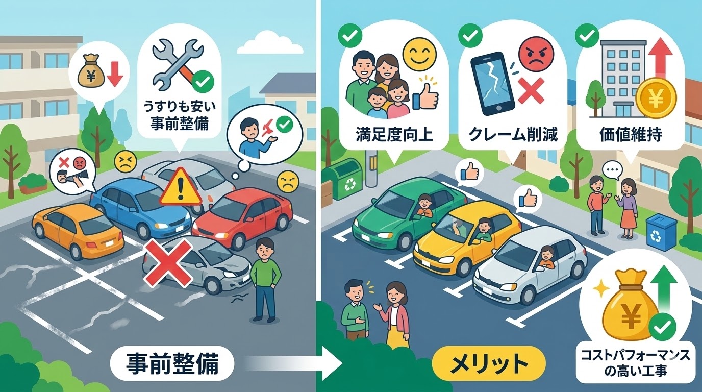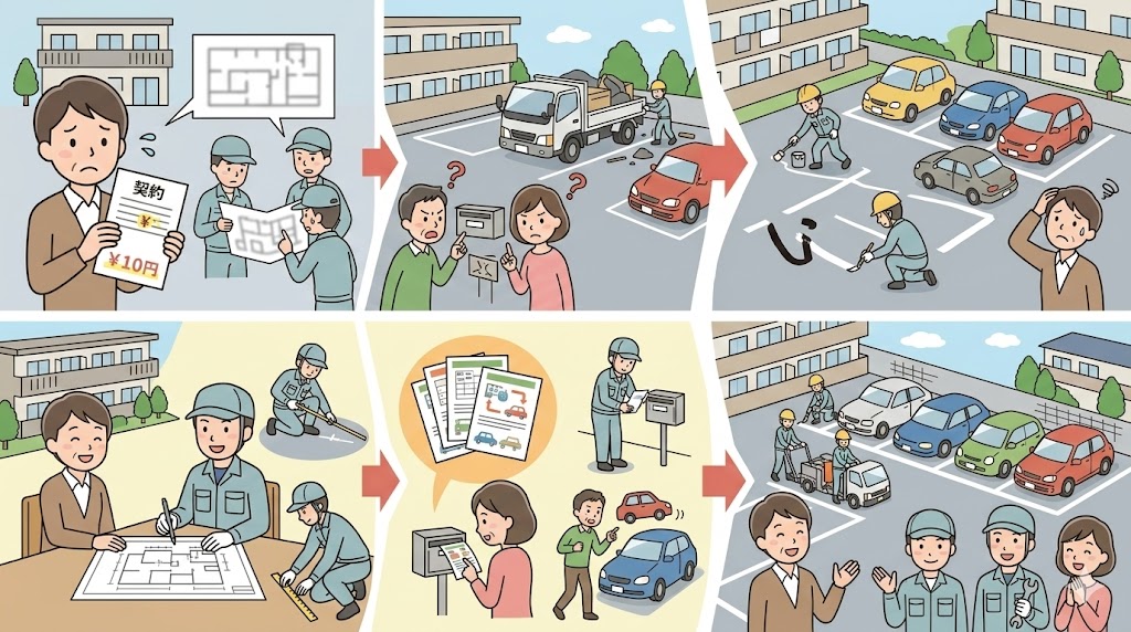 ●安さだけで業者を選んだ ●ライン幅・位置の打ち合わせ不足 ●入居者への事前案内不足 👉 事前説明と段取りが重要です。 |