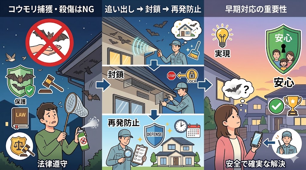 結論|コウモリ被害は「勝手に駆除すると違法」。法律を守った正しい手順で解決できます