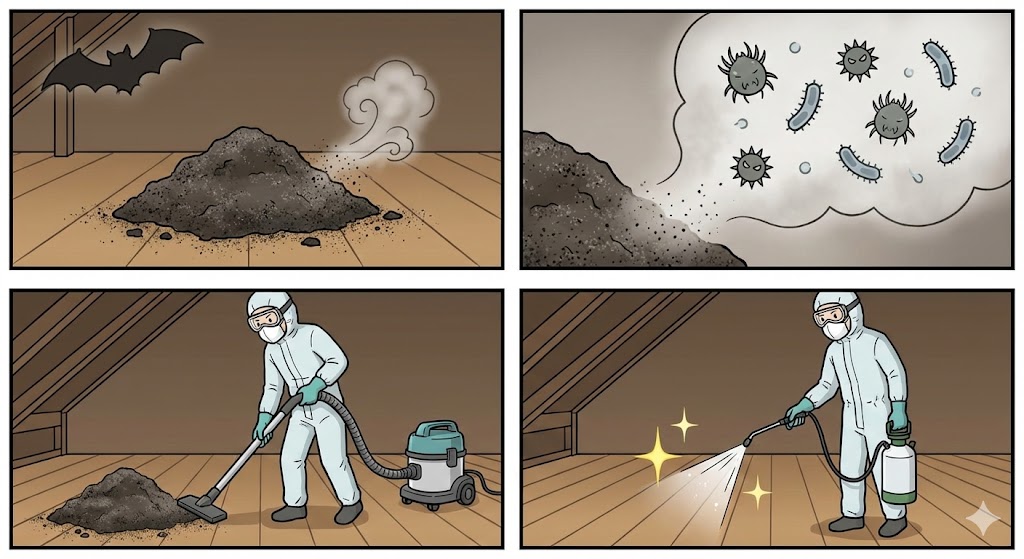 コウモリのフンは、 ●乾燥すると粉塵化 ●ダニ・菌の温床 となるため、 **清掃・消毒まで行って初めて「解決」**です。 作業内容: ●フンの除去 ●消臭 ●除菌・防ダニ処理 |