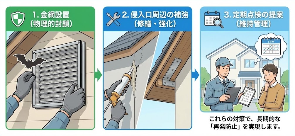 コウモリ対策で大切なのは、 ●捕獲・殺傷はNG ●追い出し → 封鎖 → 再発防止 ●法律を守った対応 という点です。 |