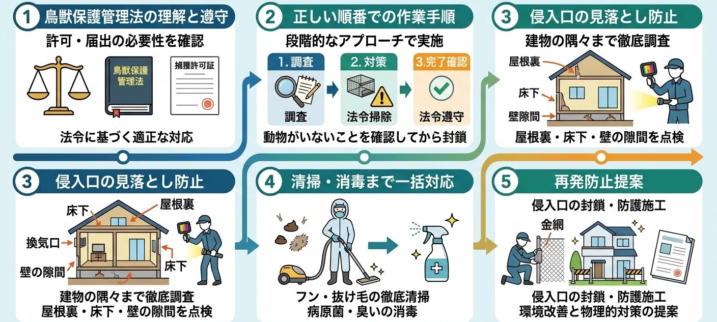 ⚠️ 重要ポイント ●捕獲・殺傷は不可 ●繁殖期(春〜夏)は作業方法に制限あり |