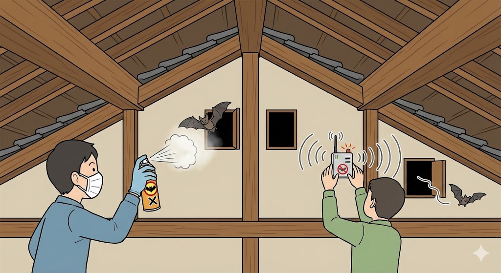 コウモリと特定できたら、**忌避剤や専用機器を使った「追い出し」**を行います。