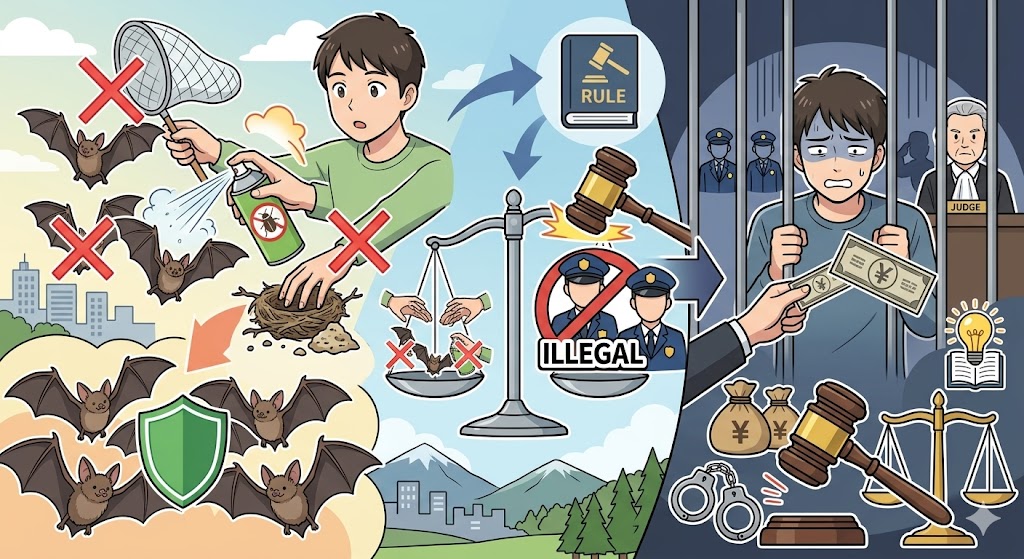 ●コウモリは「捕獲・殺傷」が原則禁止 ●許可なく捕まえる・殺す行為は違法 ●違反した場合、罰則の対象になる可能性あり |