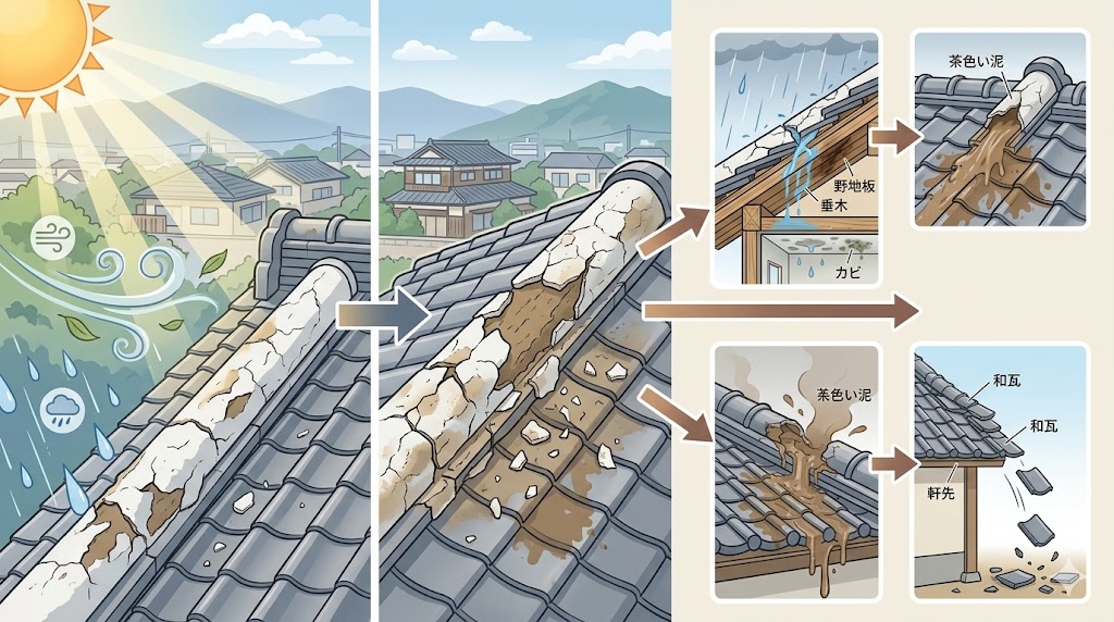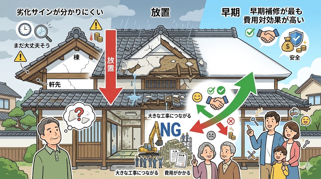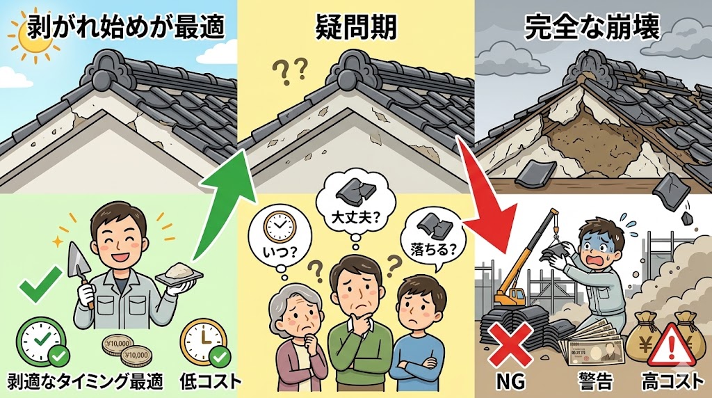 完全に崩れてからでは、漆喰補修だけで済まず、棟の積み直しや瓦補修が必要になり、費用が大きく膨らむことがあります。