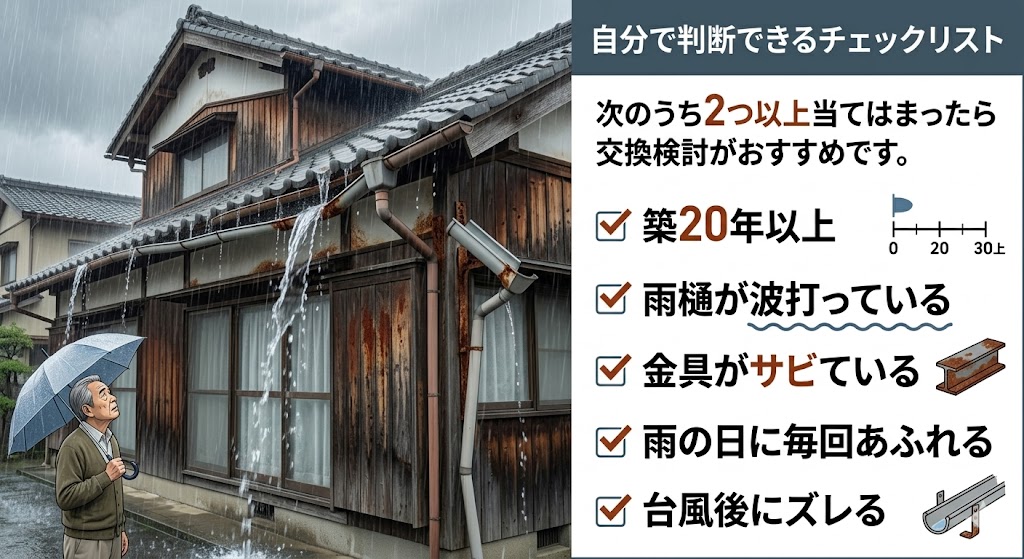 結論から言うと、雨樋は“壊れているかどうか”ではなく、「劣化の範囲」と「今後どれくらい使うか」で判断するのが正解です。