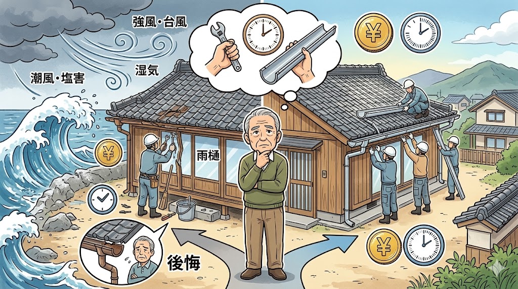 といった影響で、雨樋の寿命が内陸部より短くなりやすい地域。