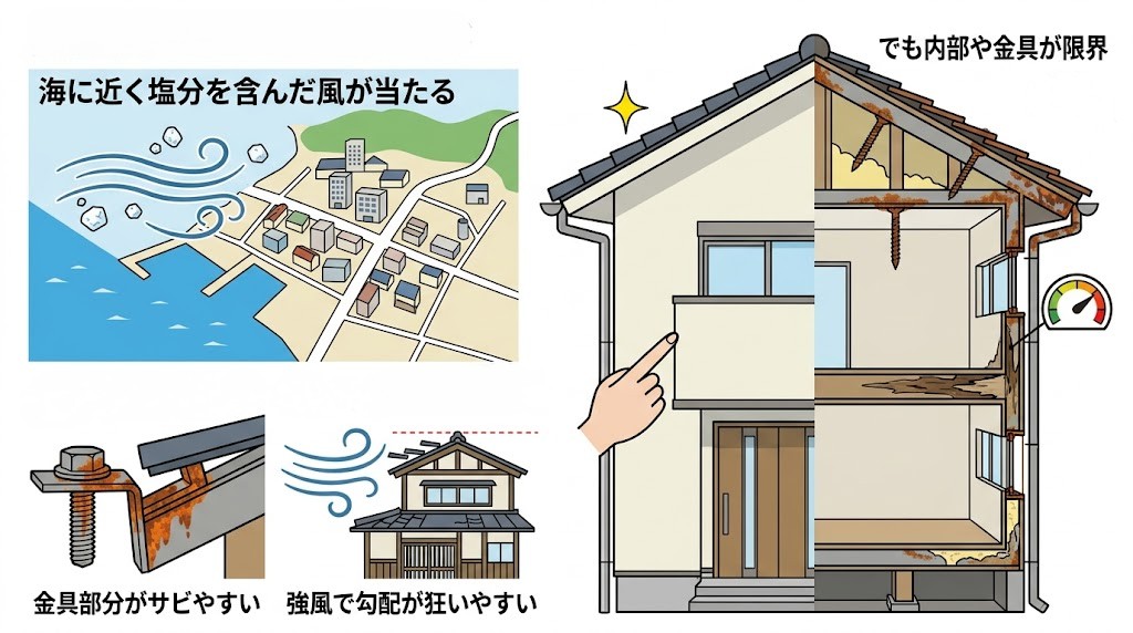 ●海に近く塩分を含んだ風が当たる ●金具部分がサビやすい ●強風で勾配が狂いやすい そのため、 ●表面はきれい ●でも内部や金具が限界 というケースも珍しくありません。 |