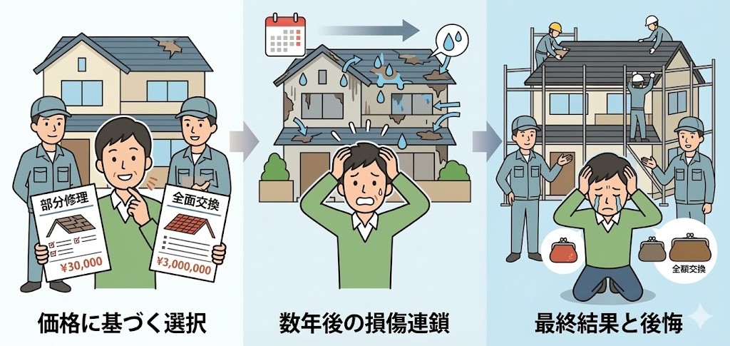 ●安さ重視で部分補修を選択 ●数年後、別箇所が次々破損 ●結局全交換になり二重出費 👉 判断基準を知らずに選ぶと、このパターンに陥りがちです。 |