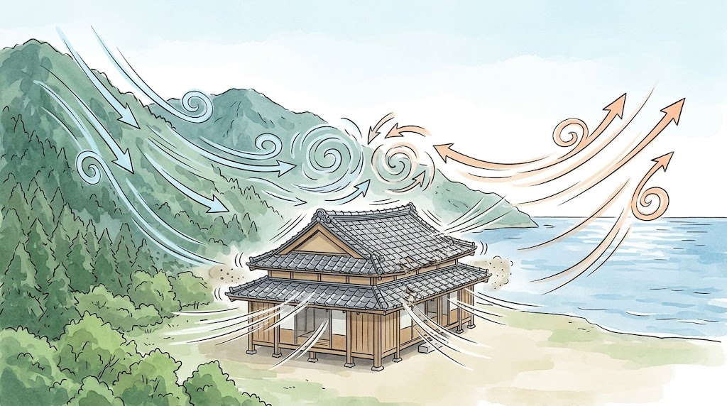 山側から吹き下ろす風と、海側から吹き上げる風がぶつかることで、 ●風向きが不安定 ●突風が起こりやすい 👉 屋根全体が“あおられる”状態になりやすいのです。 |