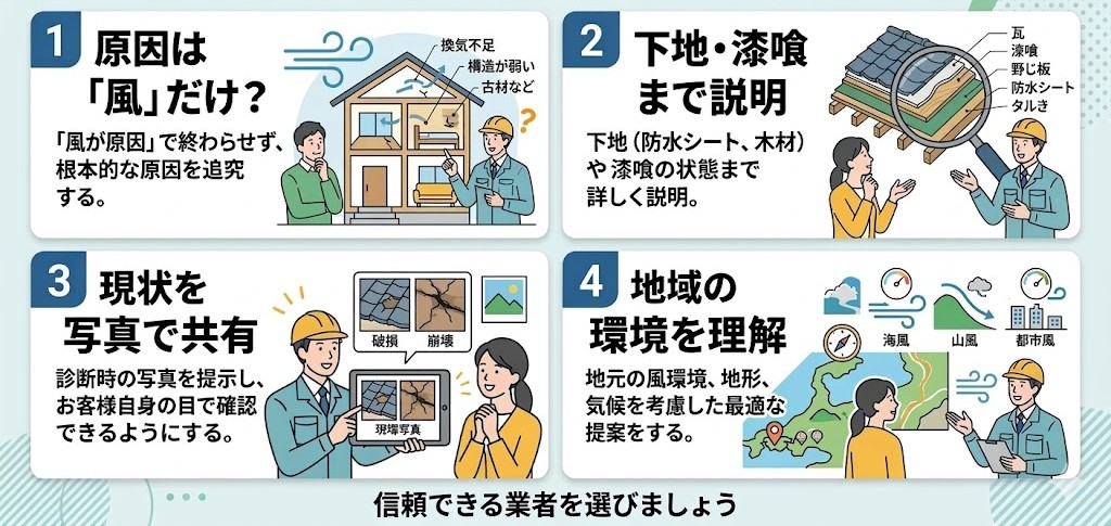 👉 強風地域では、応急対応だけでは再発しやすいのが現実です。