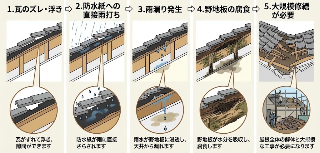 この原因を理解せずに放置すると、瓦のズレ → 雨漏り → 下地腐食という深刻なトラブルにつながります。