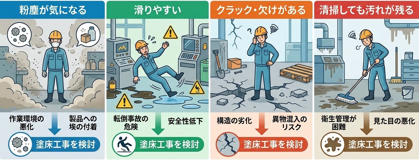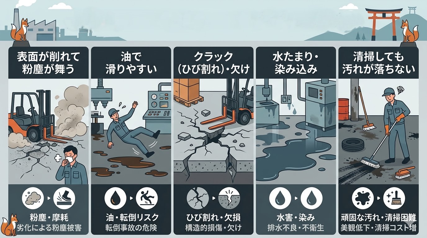 👉 表面の劣化を放置すると、ひび割れ・段差・粉塵発生が進み、転倒事故・製品汚染・設備トラブルの原因になります。