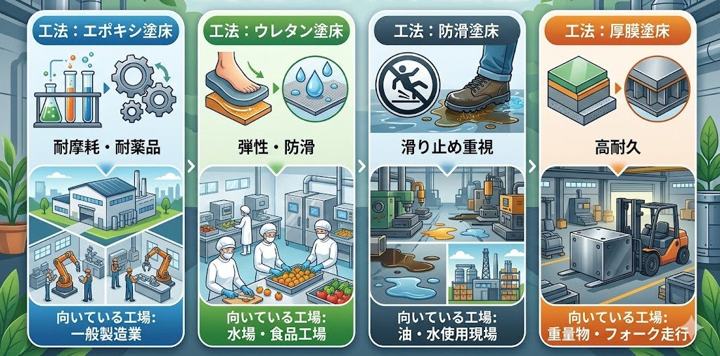 塗床工事は「見た目を整える工事」ではなく、事故防止・衛生管理・設備保護を目的とした作業環境の基盤づくりです。