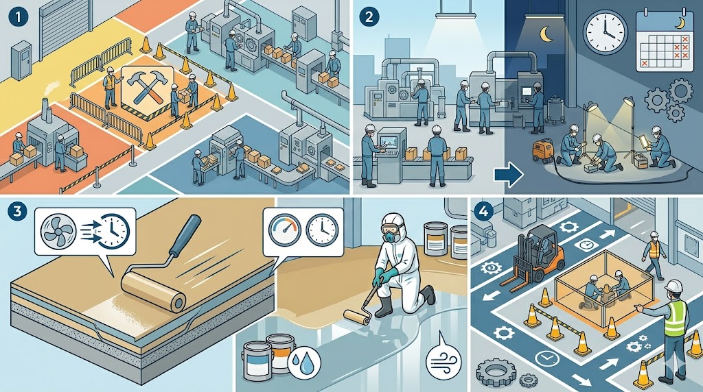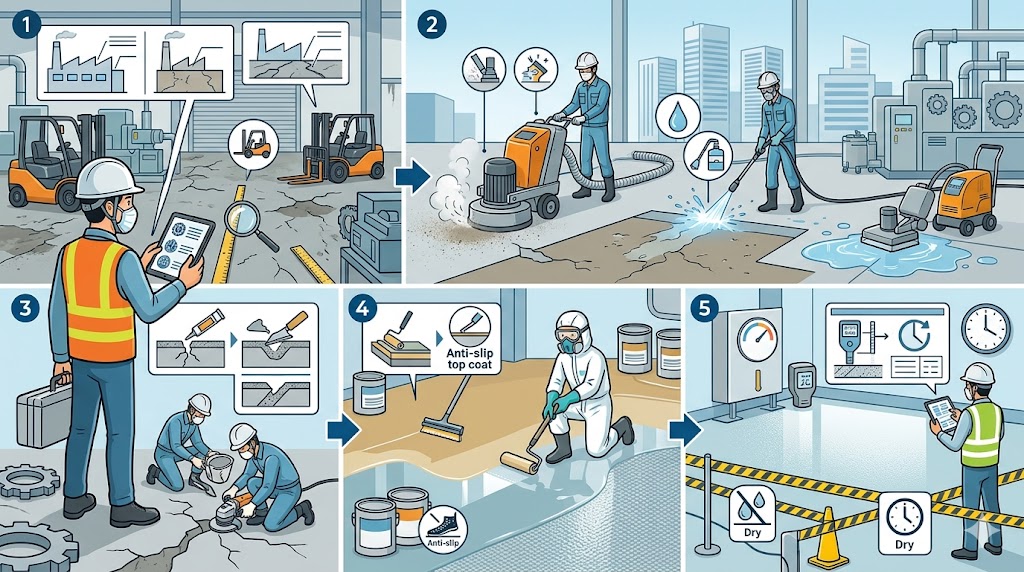 1.現地調査(床材・劣化・使用状況) 2.下地処理(研磨・清掃・油分除去) 3.補修(クラック・欠け補修) 4.塗床施工(用途別仕様) 5.養生・最終確認 |