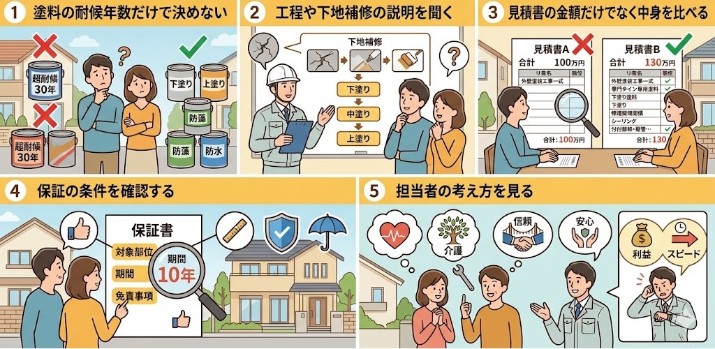 外壁塗装で後悔しないために、最初に見てほしいのは次の5つです。