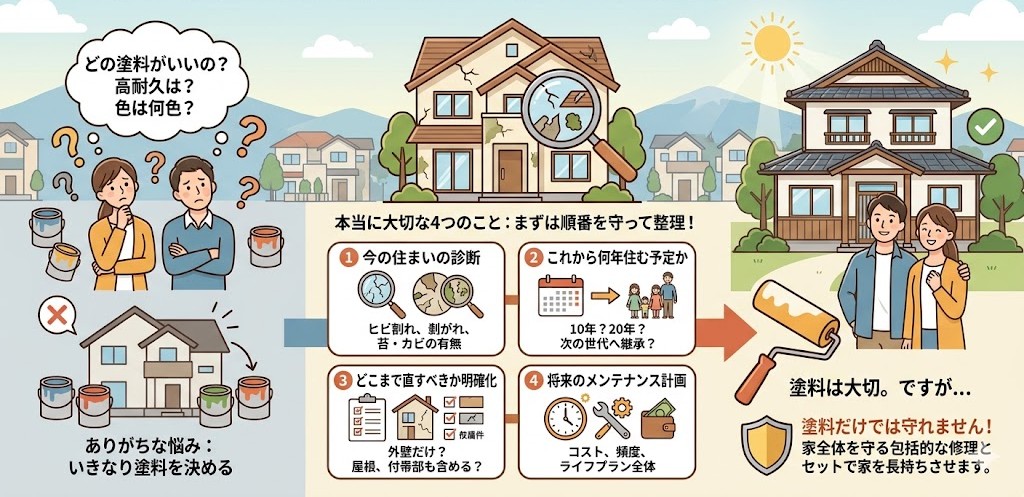 大切なのは、 ●今の住まいがどう傷んでいるか ●これから何年住む予定か ●どこまで直すべきか ●将来のメンテナンスをどう考えるか これを整理することです。 |