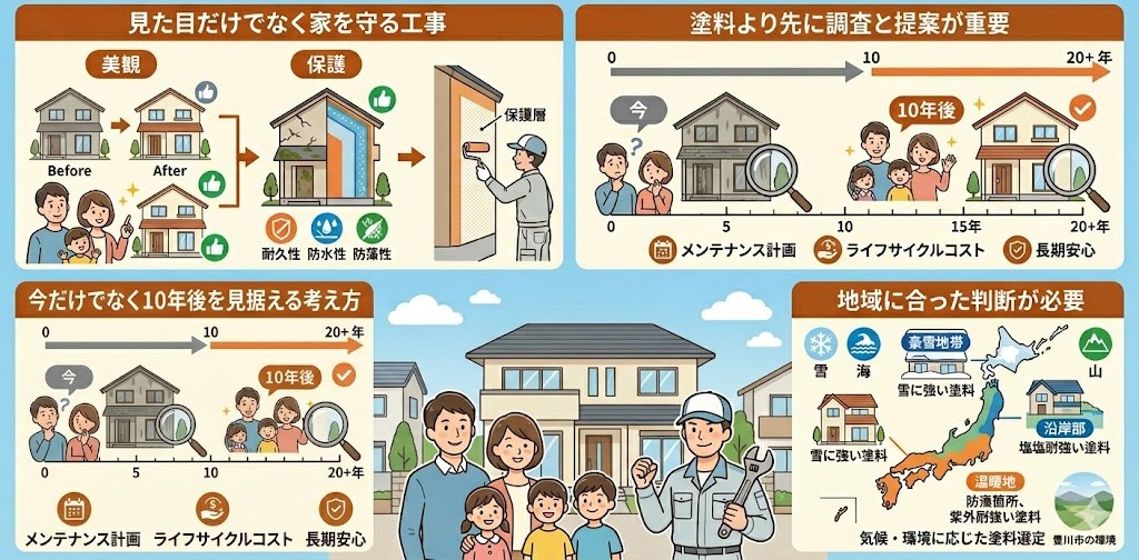 見た目を整えるだけでなく、家を守り、安心して暮らせる土台をつくる工事だからです。