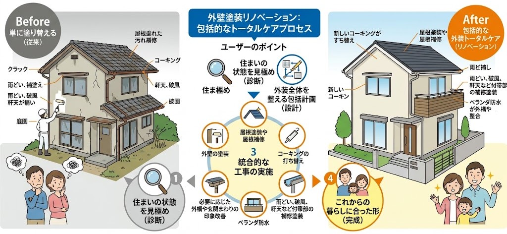 住まいの状態を見極めた上で、外装全体を整え、これからの暮らしに合った形に立て直す考え方です。