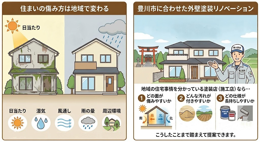 だから、豊川市で中古住宅を購入された方は、豊川市の環境に合わせた外壁塗装リノベーションを考える必要があります。