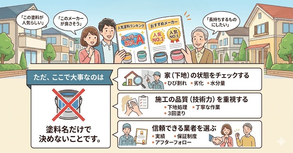 外壁塗装で大事なのは、最初から塗料名を決めることではありません。