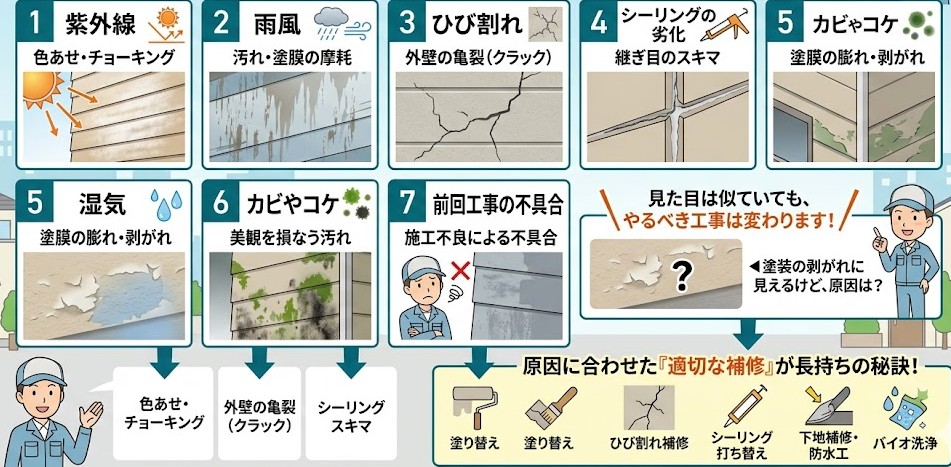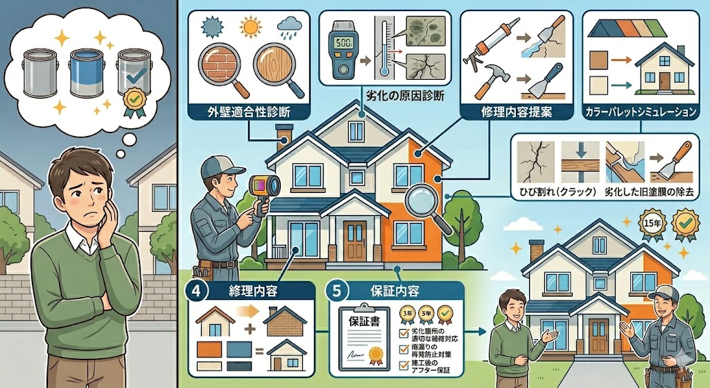 原因を見ないまま塗料だけ決めると、工事がズレることがある。