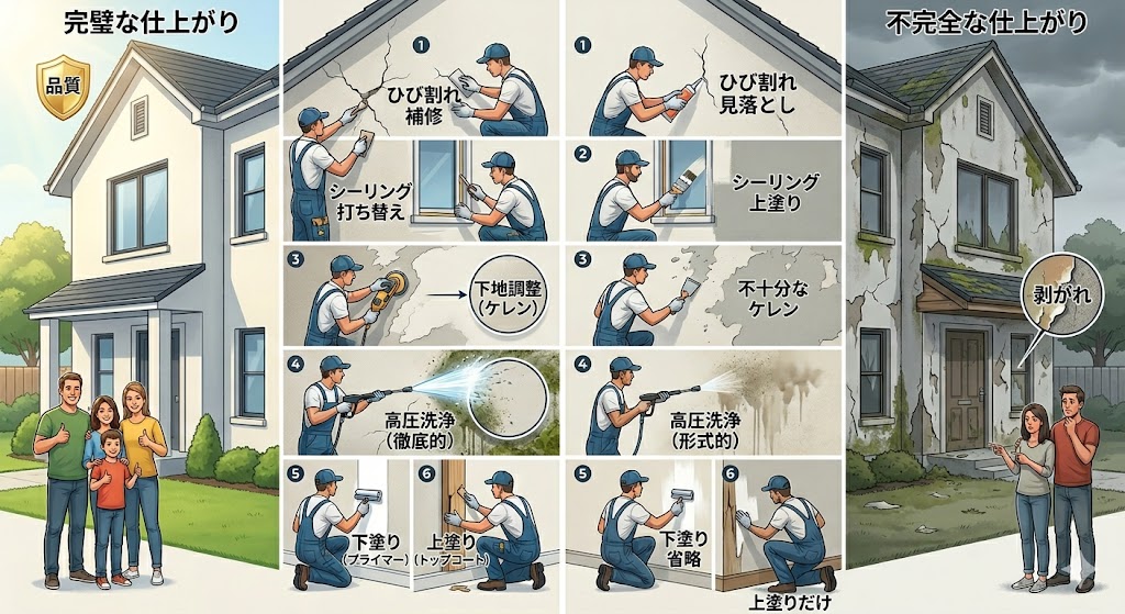 外壁塗装は、塗料選びだけで決まる工事ではありません。