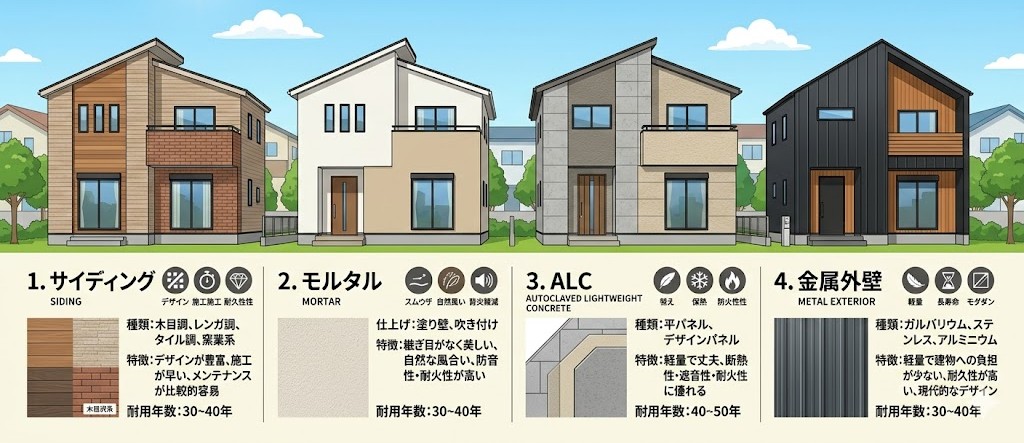 家の外壁には、 ●サイディング ●モルタル ●ALC ●金属外壁 など、いろいろあります。 |