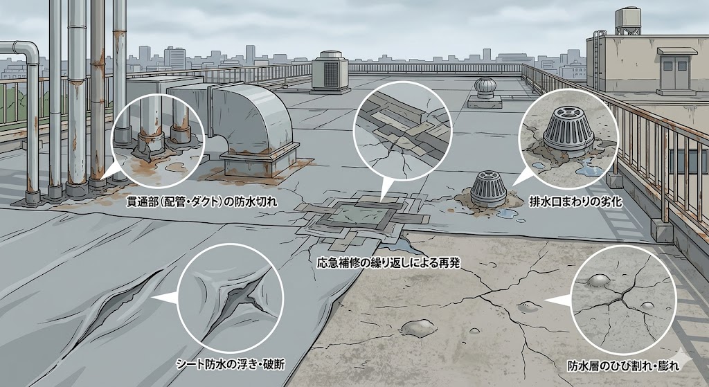 ●防水層のひび割れ・膨れ ●シート防水の浮き・破断 ●排水口まわりの劣化 ●貫通部(配管・ダクト)の防水切れ ●応急補修の繰り返しによる再発 |