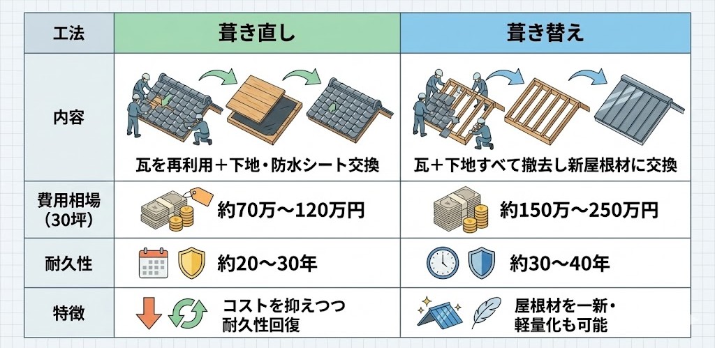 → 瓦の状態が良ければ葺き直し、劣化が進んでいれば葺き替えです。