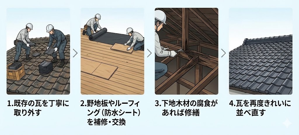 葺き直しは「瓦を外して→下地を直し→再び瓦を戻す」シンプルかつ合理的な工法です。