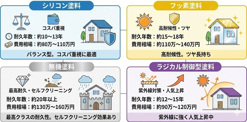 ●塗料は「短期=シリコン」「長期=無機」で選ぶと失敗しにくい