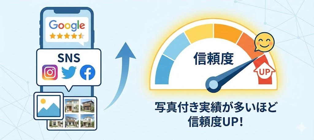 ●Google口コミやSNS、写真付き実績が多いほど信頼度UP。 ●口コミは星の数よりも「内容」が大切です。