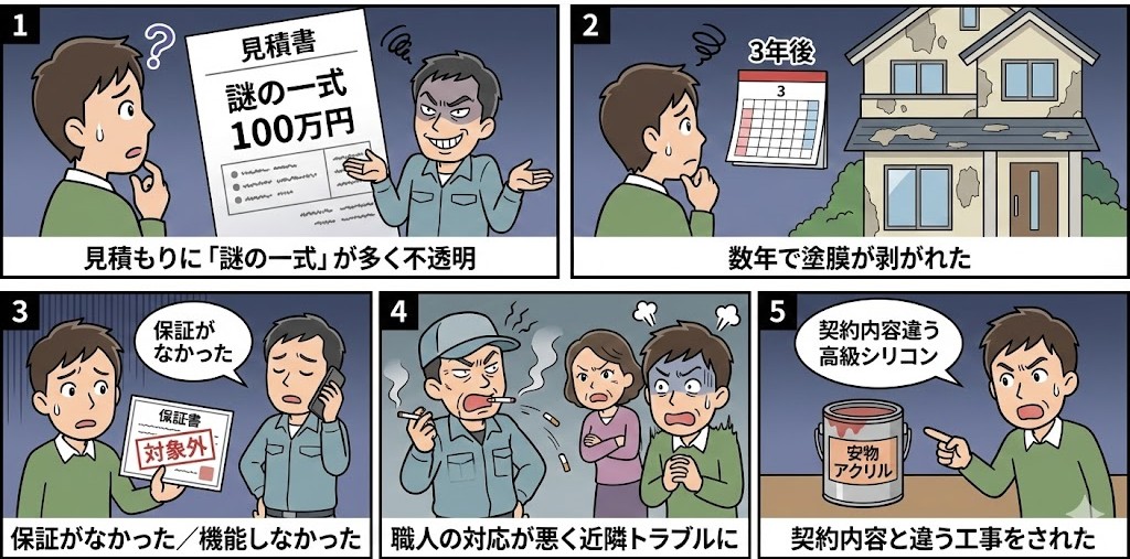 ●見積もりに「謎の一式」が多く不透明 ●数年で塗膜が剥がれた ●保証がなかった/機能しなかった ●職人の対応が悪く近隣トラブルに ●契約内容と違う工事をされた |