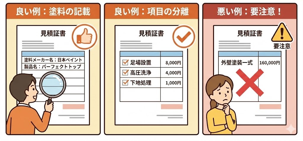 ●塗料のメーカー名・製品名が記載されているか ●足場・洗浄・下地処理が分かれているか ●「一式」表示が多い場合は要注意 |