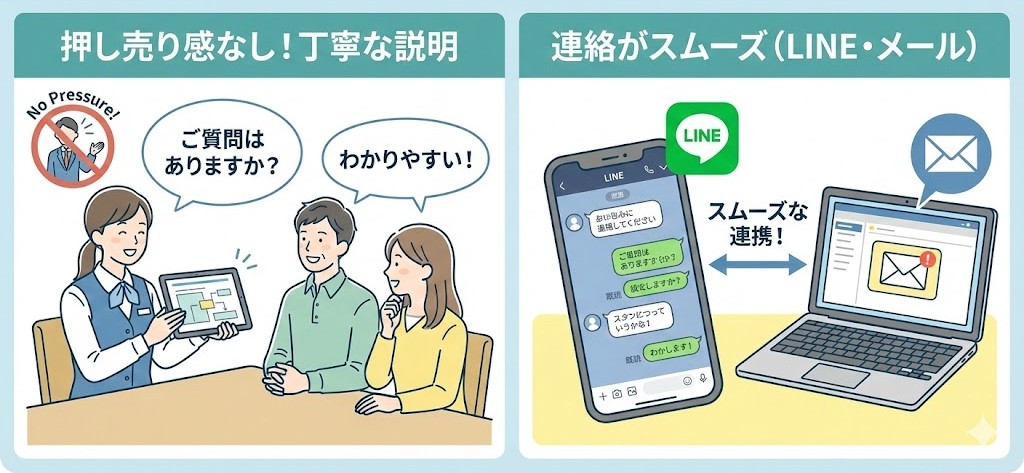●押し売り感がなく質問に丁寧に答えてくれるか ●LINEやメールでの連絡がスムーズか |
