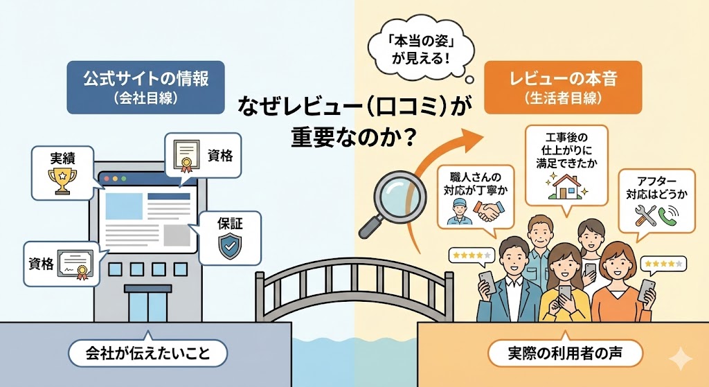 公式サイトでは「実績」「資格」「保証」など会社目線の情報が並びますが、生活者目線の本音はレビューでしか得られません。