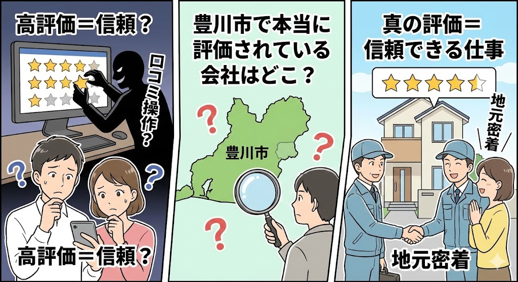 外壁塗装や屋根工事を依頼するとき、 多くの方がまず参考にするのが 「口コミ」や「評価」 です。 でも、こんな疑問はありませんか? ●評価が高い=本当に信頼できる? ●口コミって業者が操作してない? ●豊川市で実際に評価されている会社ってどこ? |