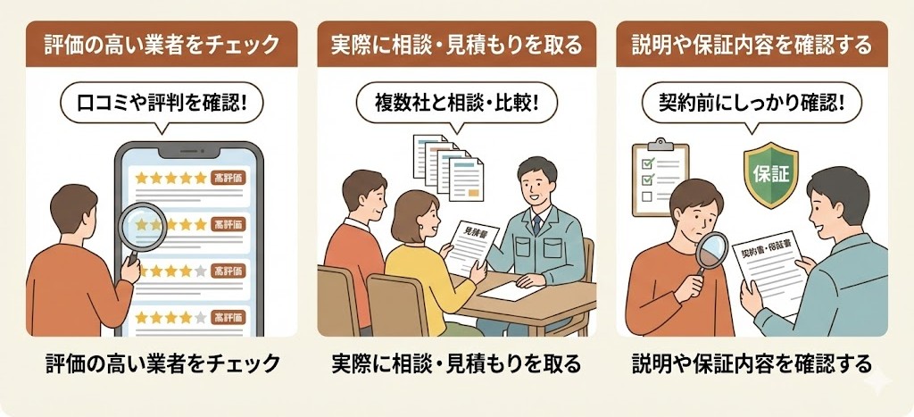→ 地元業者は小回り・アフター対応に強く、大手は保証体制が整っている傾向があります。