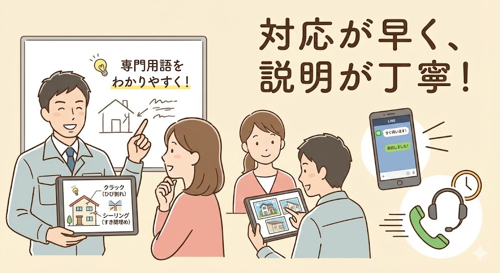 ●専門用語をかみくだいて説明 ●写真や図でわかりやすく解説 ●LINEや電話でスムーズに連絡 🗣 口コミ例:「素人でもわかるように丁寧に説明してくれた」「対応が早く安心できた」 |