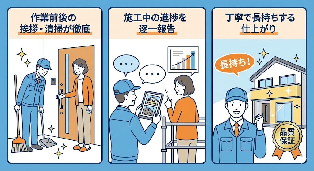 ●作業前後の挨拶・清掃が徹底 ●施工中の進捗を逐一報告 ●丁寧で長持ちする仕上がり 🗣 口コミ例:「毎朝挨拶してくれて気持ちよかった」「掃除まで丁寧で感動した」 |