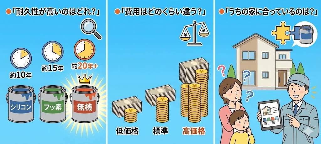 👉 本記事では、人気の「シリコン」「フッ素」「無機」塗料について、