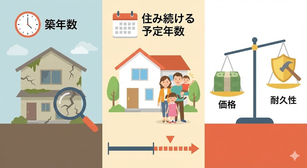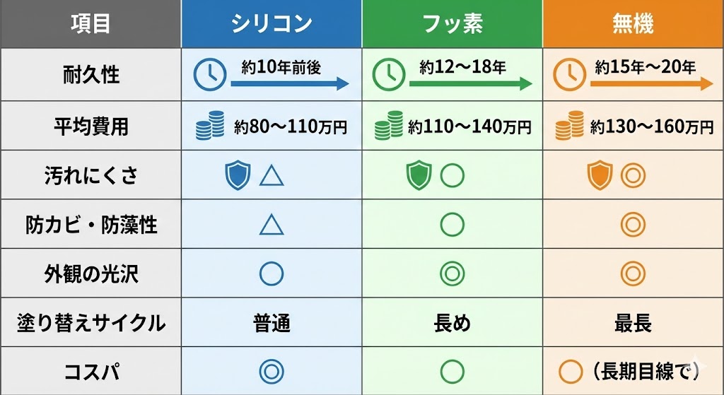 → 短期居住ならシリコンがおすすめ。長期居住なら結果的に無機やフッ素が安くなる場合もあります。
