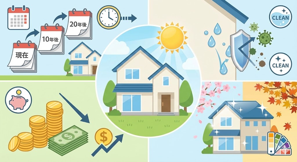 ●耐久年数(=次回塗り替えまでの期間) ●防水・防カビ・防汚効果 ●長期的なコスト ●外観の美しさの維持 |