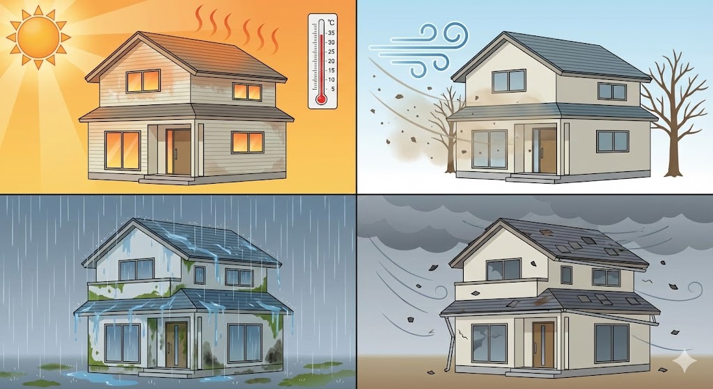 〇夏:35℃を超える猛暑日も多い 〇冬:乾燥した西風が吹く 〇梅雨:湿気と雨でカビ・コケが発生しやすい 〇秋:台風や強風で外壁・屋根の損傷が出やすい |