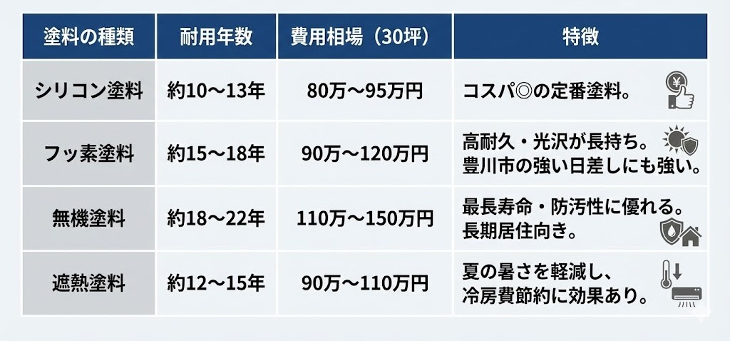 ※豊川市は日照時間が長く、夏場の屋根・外壁の温度上昇が大きいため、耐候性や遮熱性能を意識した塗料選びが重要です。