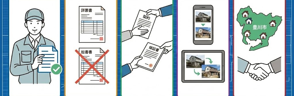 1.建設業許可・保険加入があるか(愛知県知事許可番号を確認) 2.見積書の内訳が詳細か(「一式」表記ばかりは要注意) 3.契約書・保証書の発行を徹底しているか 4.写真付き進捗報告をしてくれるか 5.地域密着の実績があるか(豊川市での施工事例確認) |