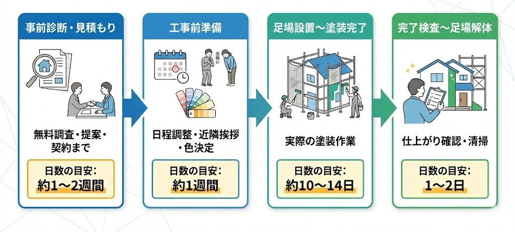 塗装工事は、契約前の診断から完了検査・アフターサポートまで3〜4週間程度が一般的。ただし、建物の劣化状態や施工内容によって日数は変わります。