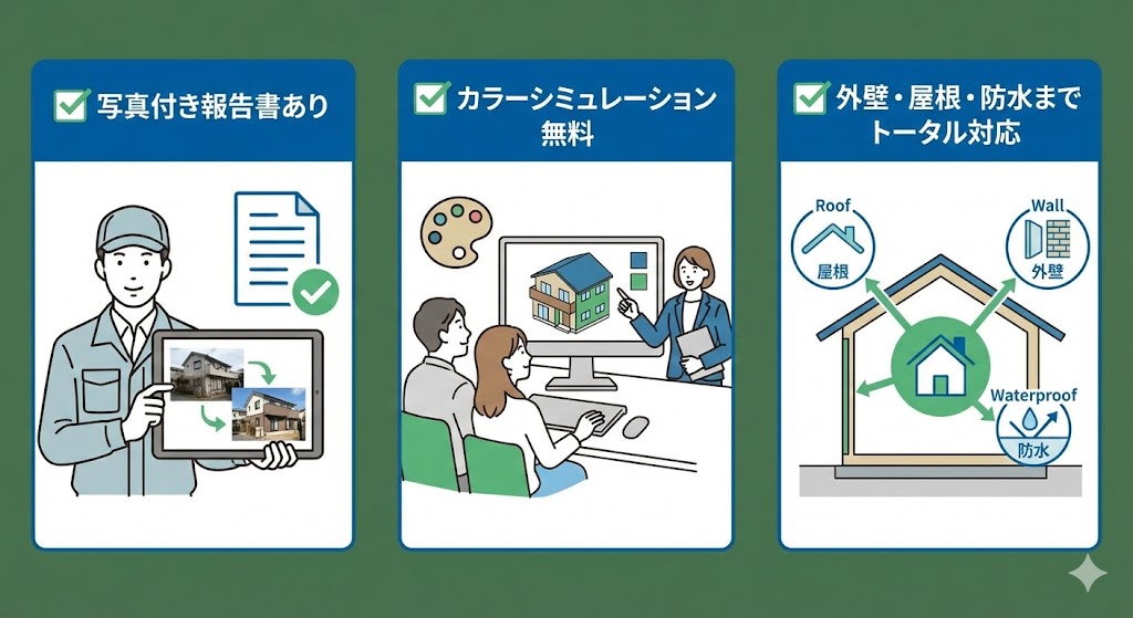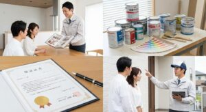 ✅ 契約チェックリスト ●使用塗料のメーカー・商品名・塗布回数(3回塗りが基本) ●足場・洗浄・養生など工事に必要な項目が含まれているか ●保証内容(塗膜保証・施工保証の有無と期間) ●工期と支払い条件 |