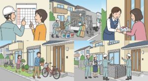 → 足場組立・高圧洗浄時に音が出ます。事前に業者が近隣挨拶を行うのが一般的です。