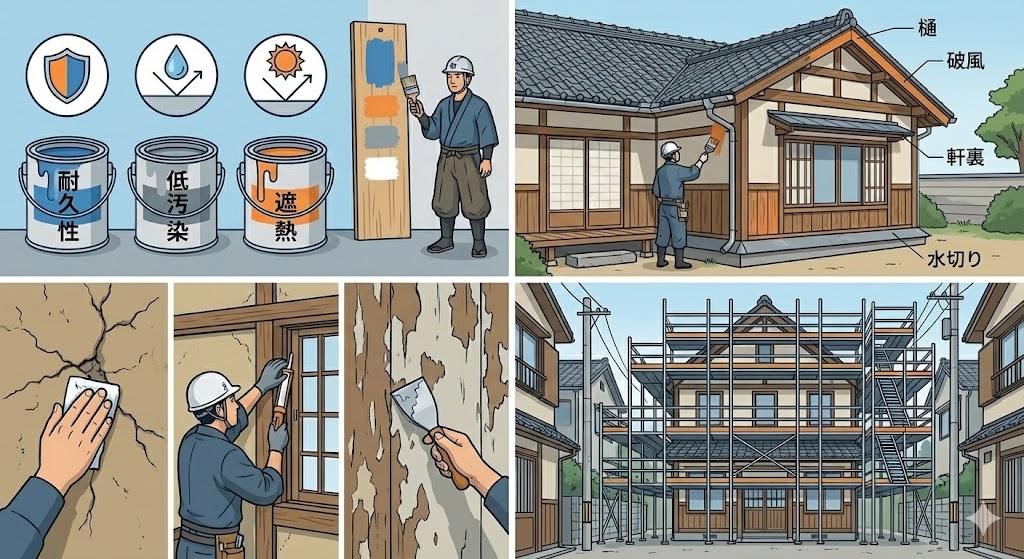 ※上記には原則、**足場・高圧洗浄・養生・下地処理・付帯部(雨樋/破風/軒天)**を含む想定。